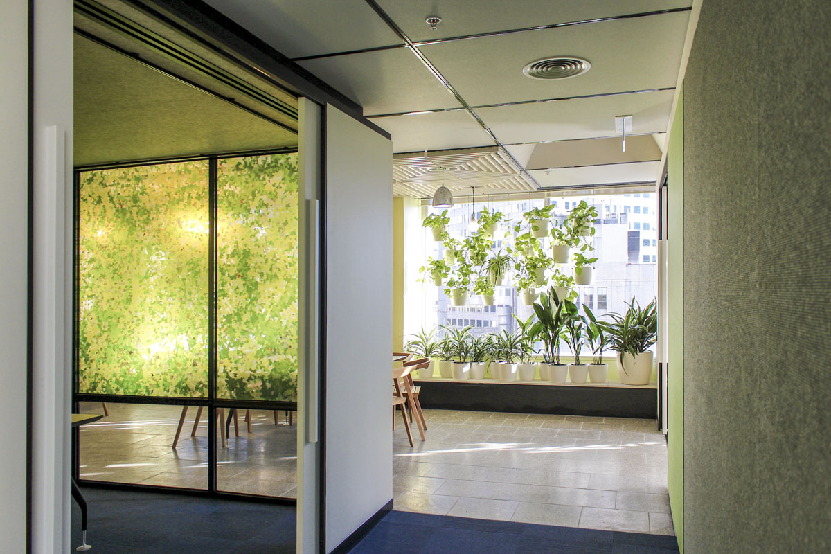 A second zone is the central circulation spine has a rich material palette and includes carpet lined private meeting pods, offices and an undulating storage spine which defines circulation and forms a landscape (and acoustic) buffer adjacent to the third zone, being south facing open work areas. The spatial dialogue on artificial gardens ranges across the spaces from plants, to cut