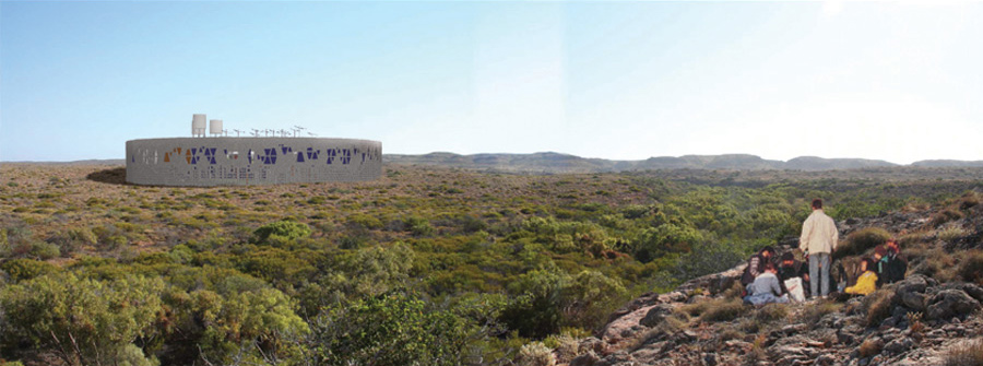 On a remote and fragile landscape, we entered into the question of how to experience and interact with that landscape in a meaningful and sustainable way. Our first move was to severely limit the footprint and create an intense and contained courtyard which acts as circulation and organiser for the building. It also contains the services of the building, from elevated water tanks to photovoltaic trees.The outside perimeter ring wall is massive and contains a sharp distinction between the interior and landscape.