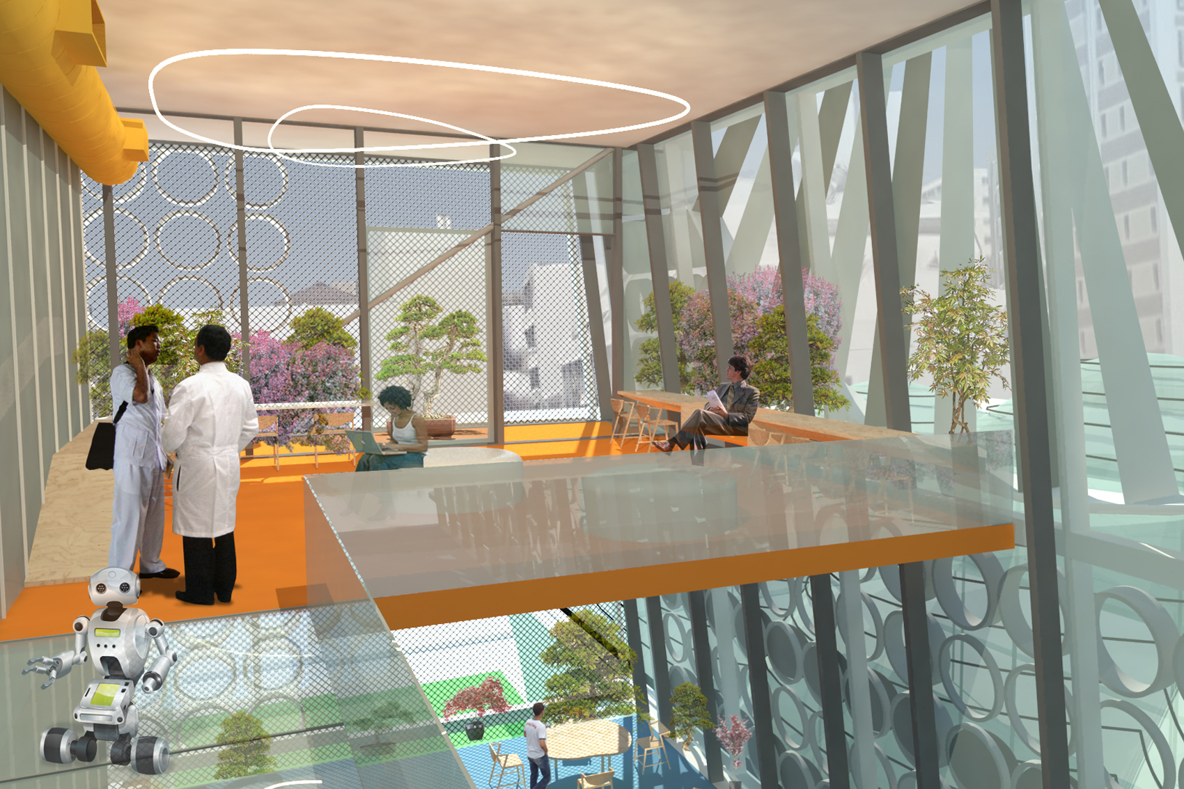 Simple open programs on each floor.A double skin filters its edges with planted wintergardens and racks of pop culture objects. The school tower sits behind the preserved walls of the old buildings on the street and leaves a large open space around it. An open space covered with an inflated bubble roof makes an artificial park and huge informal space for performance rehearsal and large gathering beside the tower.